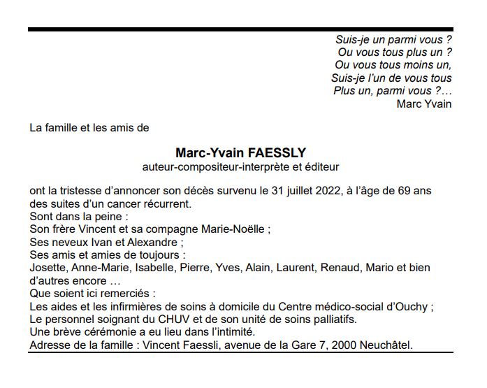 Marc-Yvain FAESSLY 07 avr. 1953 - 31 juil. 2022 Avis mortuaire PFG Télecharger PDF Partager sur: Galerie PreviousNext PreviousNext