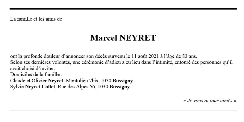 Marcel NEYRET 23 juin. 1938 - 11 aoû. 2021 Avis mortuaire PFG Télecharger PDF Partager sur: Galerie PreviousNext PreviousNext
