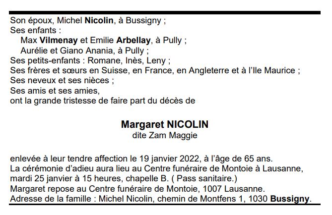 Margaret NICOLIN 22 oct. 1956 - 19 jan. 2022 Avis mortuaire PFG Télecharger PDF Partager sur: Galerie PreviousNext PreviousNext
