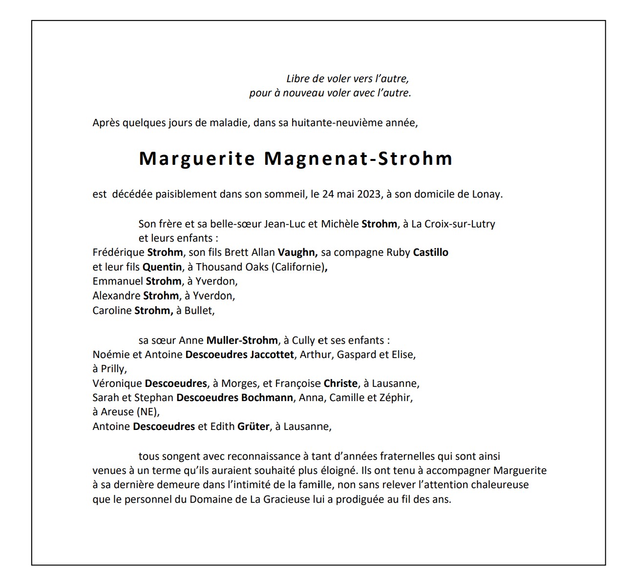 Marguerite Magnenat-Strohm 14 mar. 1935 - 24 mai. 2023 Avis mortuaire PFG Télecharger PDF Partager sur: Galerie PreviousNext PreviousNext