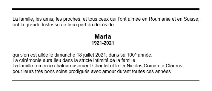 Maria MAZILU 09 sep. 1921 - 18 juil. 2021 Avis mortuaire PFG Télecharger PDF Partager sur: Galerie PreviousNext PreviousNext