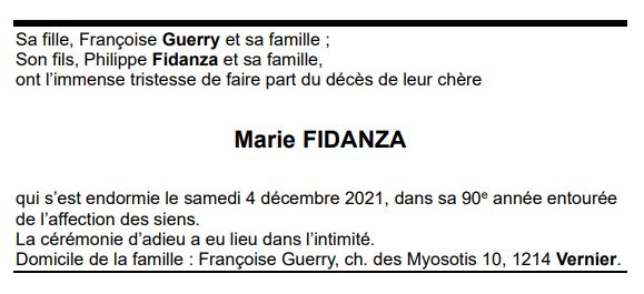 Marie FIDANZA 03 aoû. 1932 - 04 déc. 2021 Avis mortuaire PFG Télecharger PDF Partager sur: Galerie PreviousNext PreviousNext