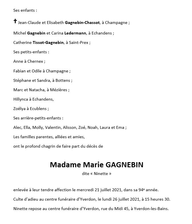 Marie GAGNEBIN 15 déc. 1927 - 21 juil. 2021 Avis mortuaire PFG Télecharger PDF Partager sur: Galerie PreviousNext PreviousNext