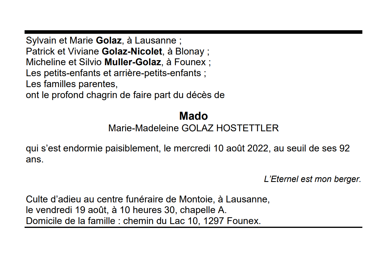 Marie-Madeleine GOLAZ HOSTETTLER 28 oct. 1930 - 10 aoû. 2022 Avis mortuaire PFG Télecharger PDF Partager sur: Galerie PreviousNext PreviousNext