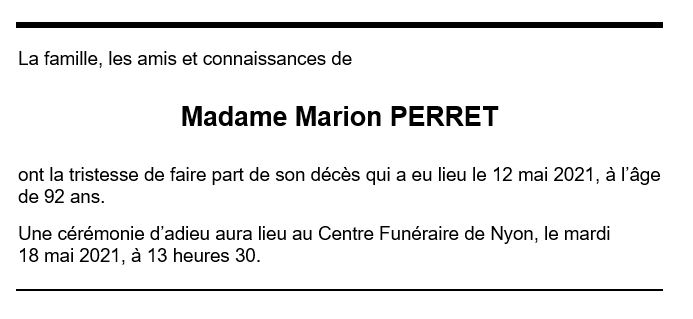 Marion Lory PERRET née BANDINI 21 juin. 1928 - 12 mai. 2021 Avis mortuaire PFG Télecharger PDF Partager sur: Galerie PreviousNext PreviousNext