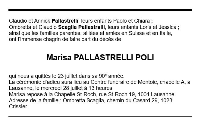 Marisa PALLASTRELLI POLI 13 sep. 1931 - 23 juil. 2021 Avis mortuaire PFG Télecharger PDF Partager sur: Galerie PreviousNext PreviousNext
