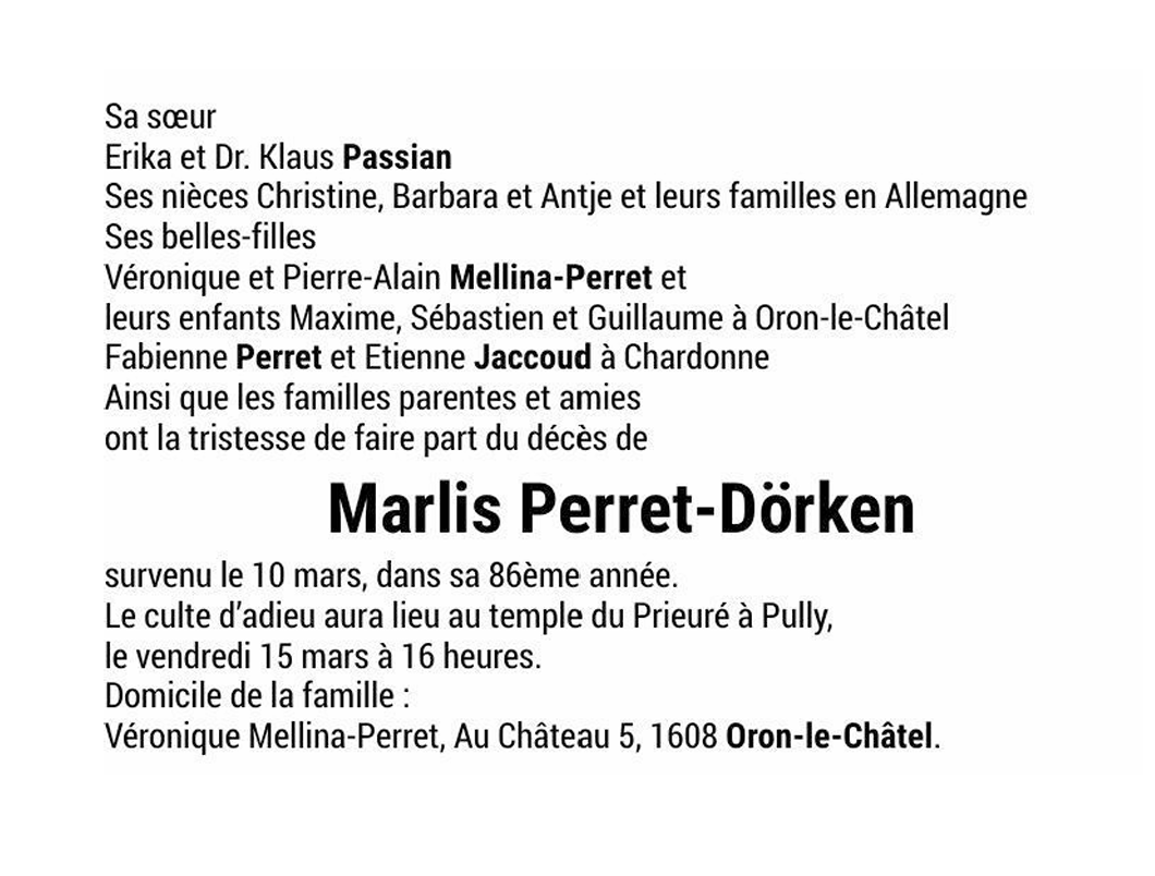 Marlis Perret-Dörken 21 juil. 1938 - 10 mar. 2024 Avis mortuaire PFG Télecharger PDF Partager sur: Galerie PreviousNext PreviousNext