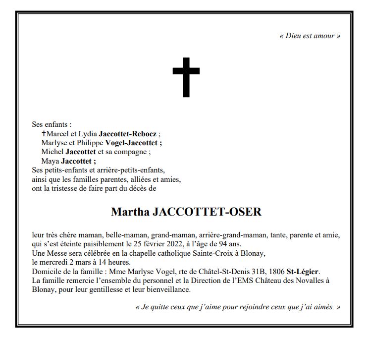 Martha JACCOTTET-OSER 16 fév. 1928 - 25 fév. 2022 Avis mortuaire PFG Télecharger PDF Partager sur: Galerie PreviousNext PreviousNext