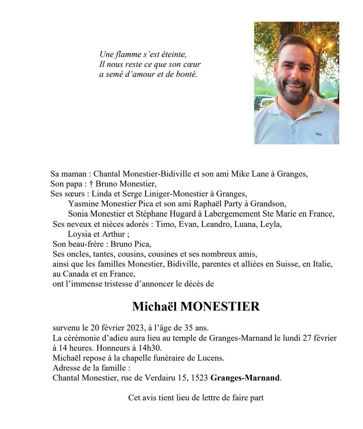Michaël MONESTIER 06 oct. 1987 - 20 fév. 2023 Avis mortuaire PFG Télecharger PDF Partager sur: Galerie PreviousNext PreviousNext