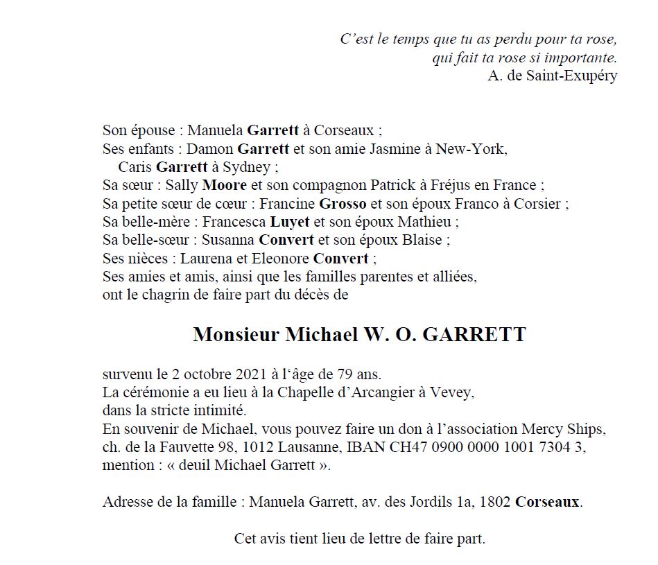 Michael W. O. Garrett 24 mai. 1942 - 02 oct. 2021 Avis mortuaire PFG Télecharger PDF Partager sur: Galerie PreviousNext PreviousNext