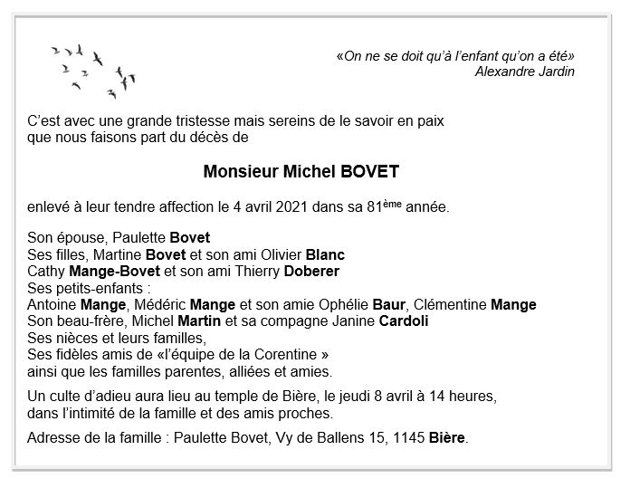 Michel BOVET 12 oct. 1940 - 04 avr. 2021 Avis mortuaire PFG Télecharger PDF Partager sur: Galerie PreviousNext PreviousNext