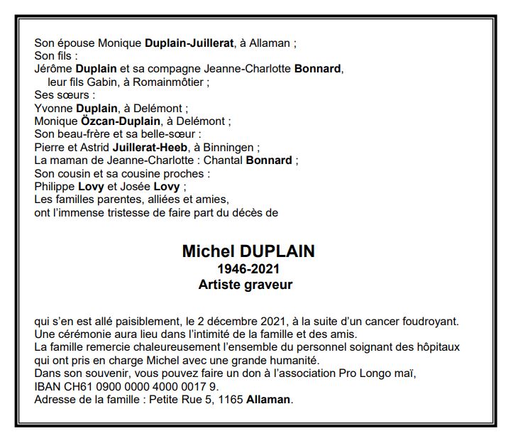 Michel DUPLAIN 07 oct. 1946 - 02 déc. 2021 Avis mortuaire PFG Télecharger PDF Partager sur: Galerie PreviousNext PreviousNext