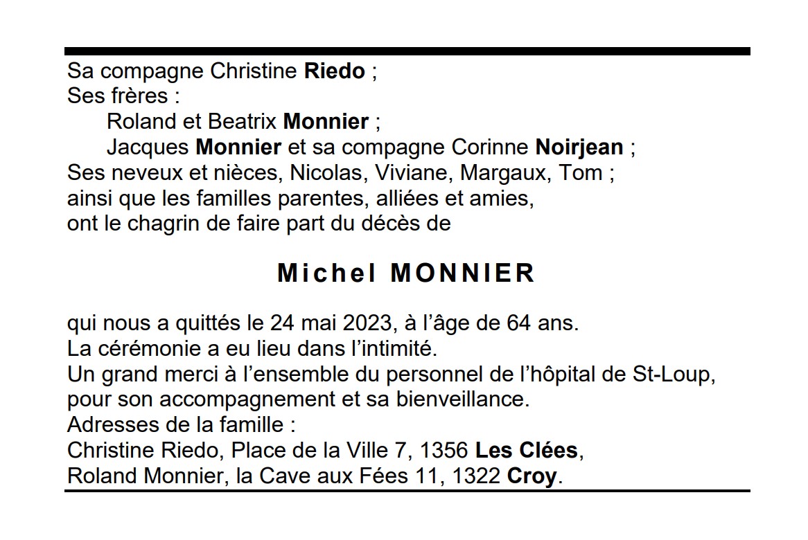 Michel MONNIER 19 jan. 1959 - 24 mai. 2023 Avis mortuaire PFG Télecharger PDF Partager sur: Galerie PreviousNext PreviousNext