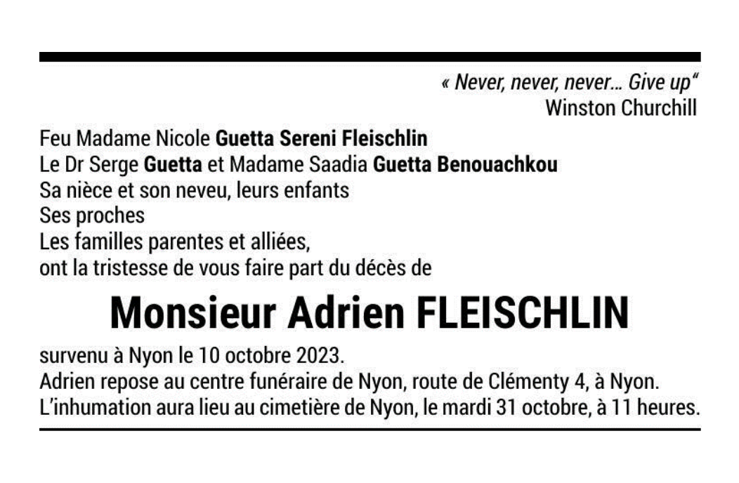 Monsieur Adrien FLEISCHLIN 10 mar. 1938 - 10 oct. 2023 Avis mortuaire PFG Télecharger PDF Partager sur: Galerie PreviousNext PreviousNext