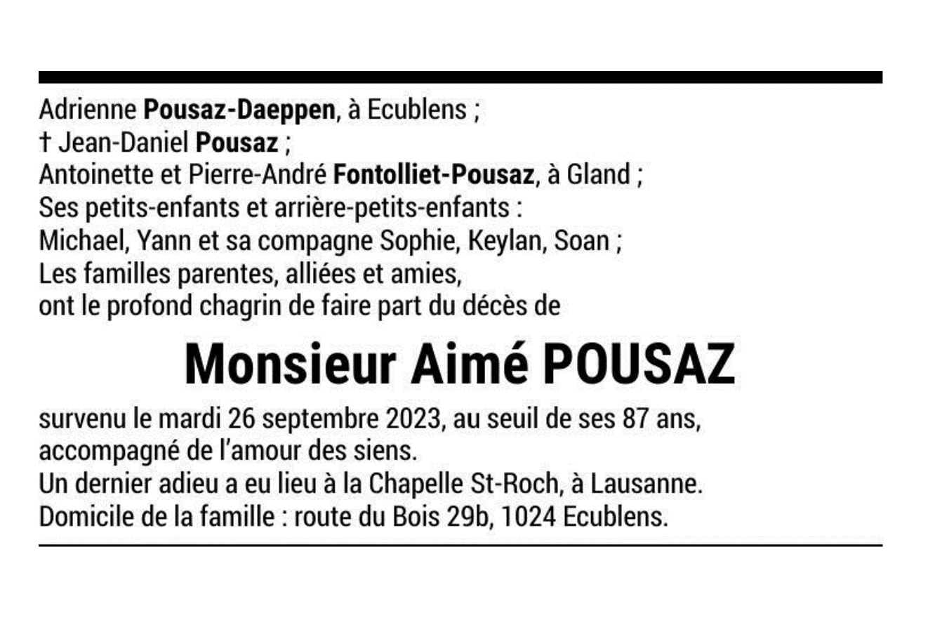 Monsieur Aimé POUSAZ 15 nov. 1936 - 26 sep. 2023 Avis mortuaire PFG Télecharger PDF Partager sur: Galerie PreviousNext PreviousNext