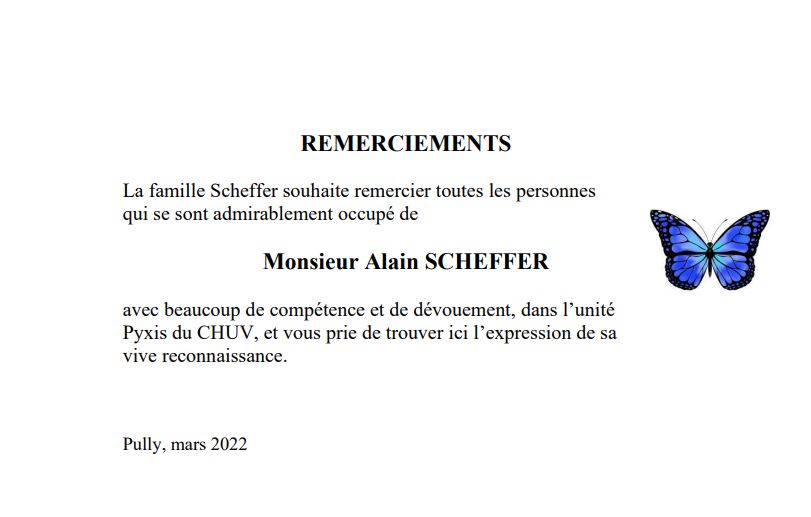 Monsieur Alain SCHEFFER 24 oct. 1946 - 28 fév. 2022 Avis mortuaire PFG Télecharger PDF Partager sur: Galerie PreviousNext PreviousNext