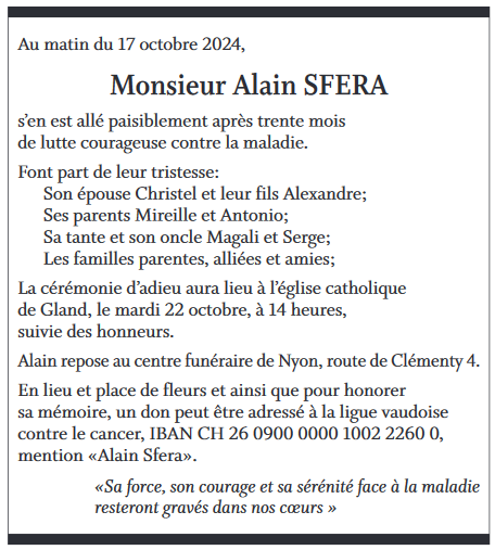 Monsieur Alain SFERA 04 sep. 1970 - 17 oct. 2024 Avis mortuaire PFG Télecharger PDF Partager sur: Galerie PreviousNext PreviousNext