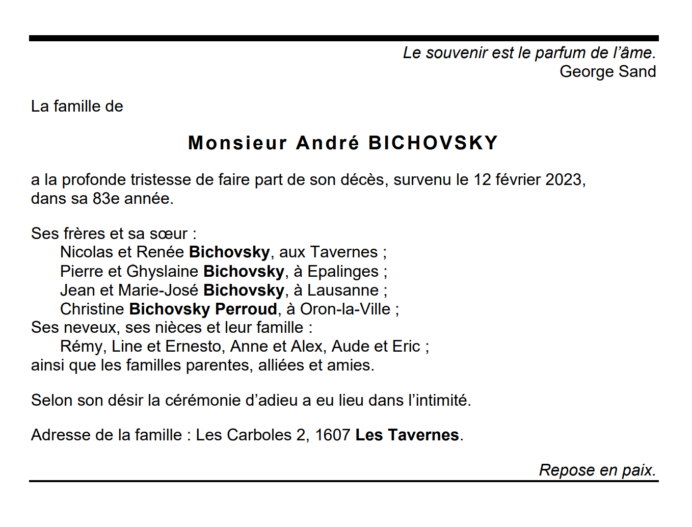 Monsieur André BICHOVSKY 19 aoû. 1940 - 12 fév. 2023 Avis mortuaire PFG Télecharger PDF Partager sur: Galerie PreviousNext PreviousNext