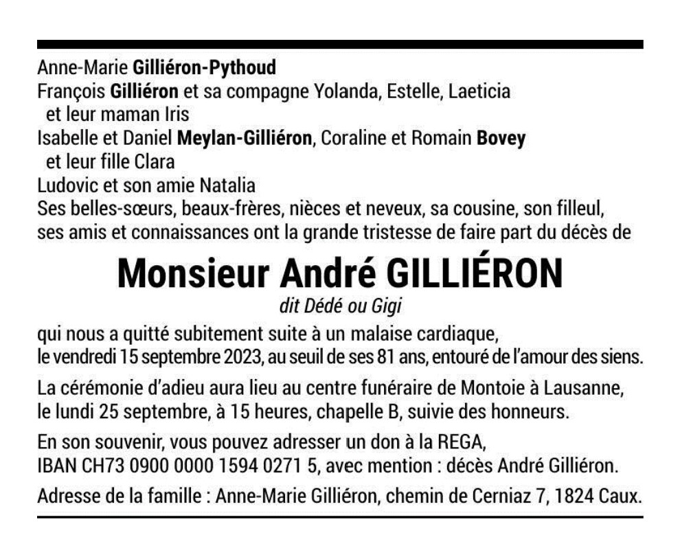 Monsieur André GILLIÉRON dit Dédé ou Gigi 26 sep. 1942 - 15 sep. 2023 Avis mortuaire PFG Télecharger PDF Partager sur: Galerie PreviousNext PreviousNext
