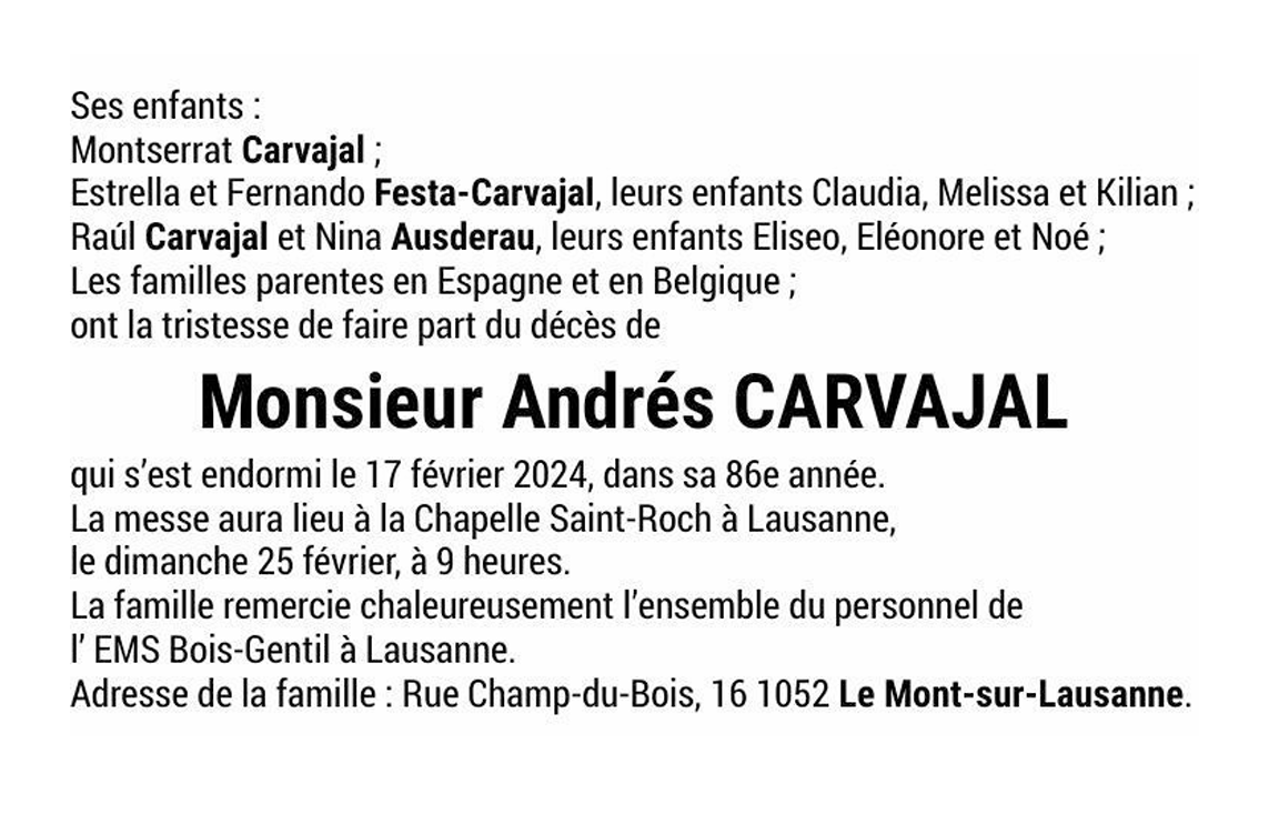 Monsieur Andrés CARVAJAL 26 mar. 1938 - 17 fév. 2024 Avis mortuaire PFG Télecharger PDF Partager sur: Galerie PreviousNext PreviousNext