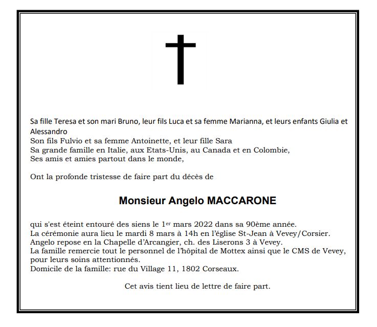 Monsieur Angelo MACCARONE 18 avr. 1932 - 01 mar. 2022 Avis mortuaire PFG Télecharger PDF Partager sur: Galerie PreviousNext PreviousNext