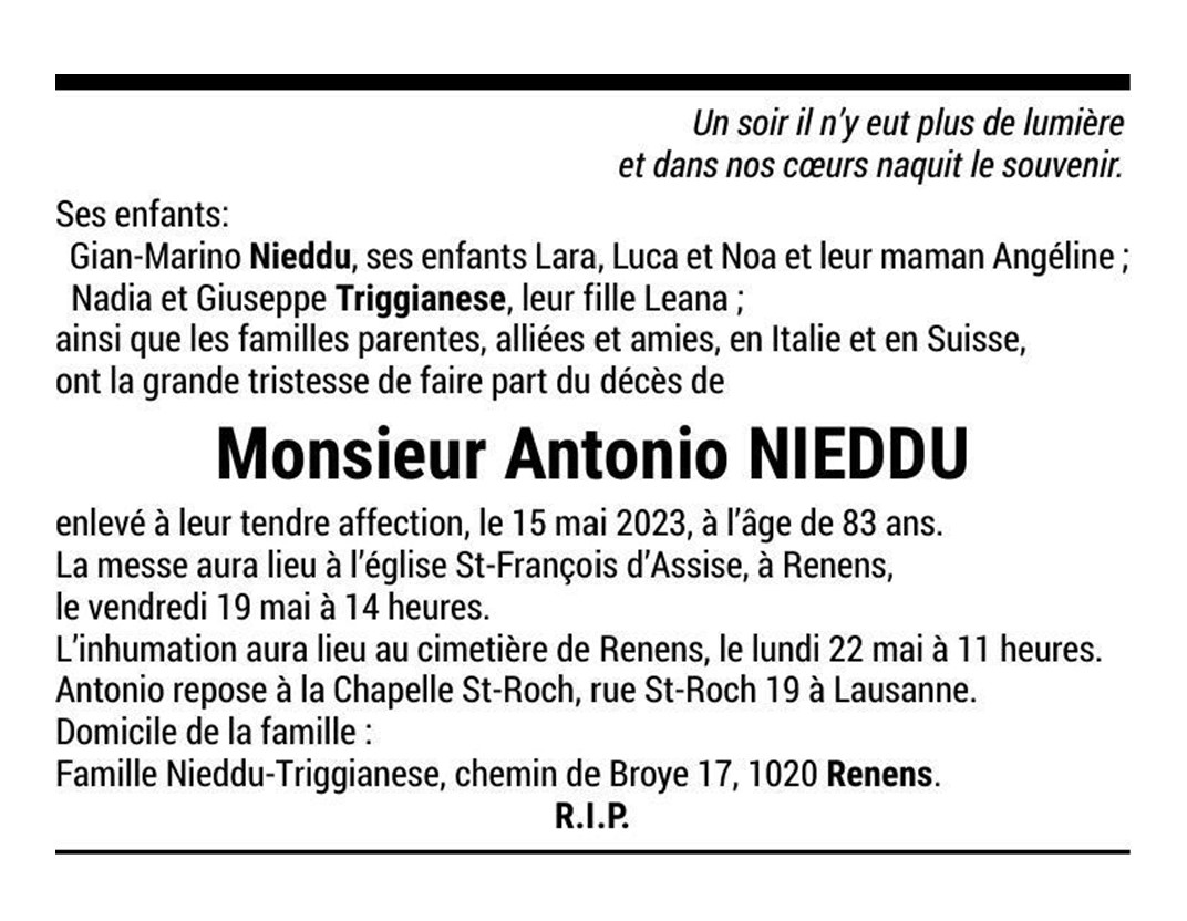 Monsieur Antonio NIEDDU 08 mar. 1940 - 15 mai. 2023 Avis mortuaire PFG Télecharger PDF Partager sur: Galerie PreviousNext PreviousNext