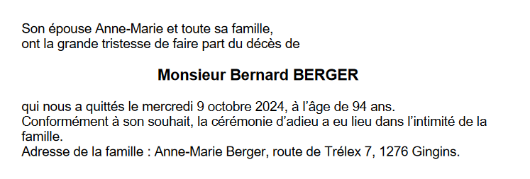 Monsieur Bernard BERGER 18 aoû. 1930 - 09 oct. 2024 Avis mortuaire PFG Télecharger PDF Partager sur: Galerie