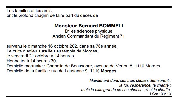 Monsieur Bernard BOMMELI 28 déc. 1946 - 16 oct. 2022 Avis mortuaire PFG Télecharger PDF Partager sur: Galerie PreviousNext PreviousNext