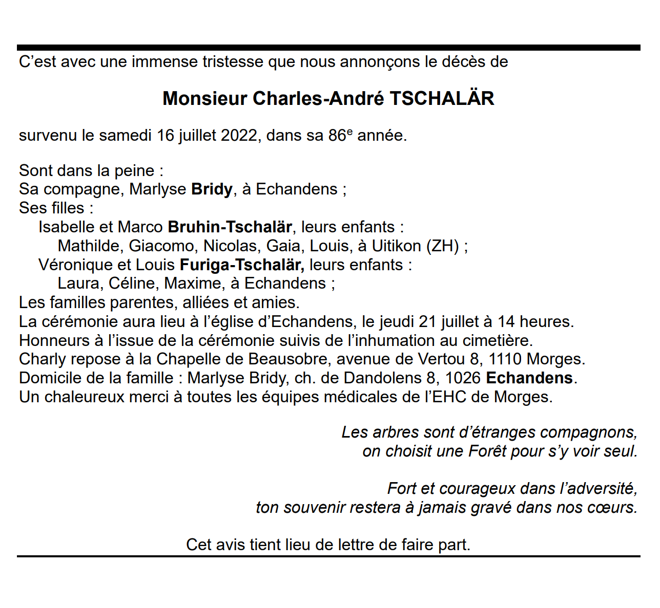 Monsieur Charles-André TSCHALÄR 27 fév. 1937 - 16 juil. 2022 Avis mortuaire PFG Télecharger PDF Partager sur: Galerie PreviousNext PreviousNext