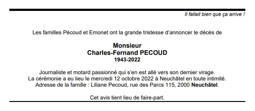 Monsieur Charles-Fernand PECOUD 29 aoû. 1943 - 06 oct. 2022 Avis mortuaire PFG Télecharger PDF Partager sur: Galerie PreviousNext PreviousNext