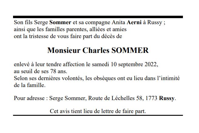 Monsieur Charles SOMMER 27 sep. 1944 - 10 sep. 2022 Avis mortuaire PFG Télecharger PDF Partager sur: Galerie