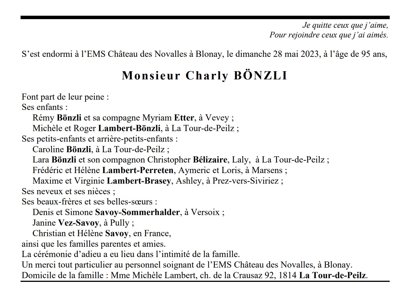 Monsieur Charly BÖNZLI 07 mai. 1928 - 28 mai. 2023 Avis mortuaire PFG Télecharger PDF Partager sur: Galerie PreviousNext PreviousNext