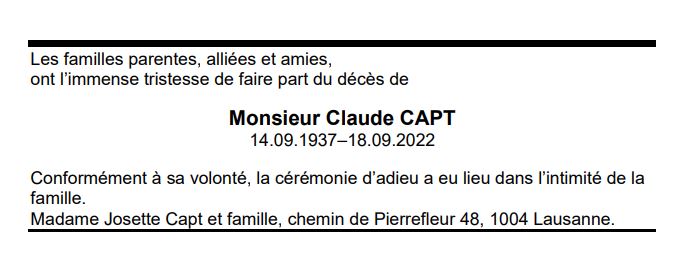 Monsieur Claude CAPT 14 sep. 1937 - 18 sep. 2022 Avis mortuaire PFG Télecharger PDF Partager sur: Galerie PreviousNext PreviousNext