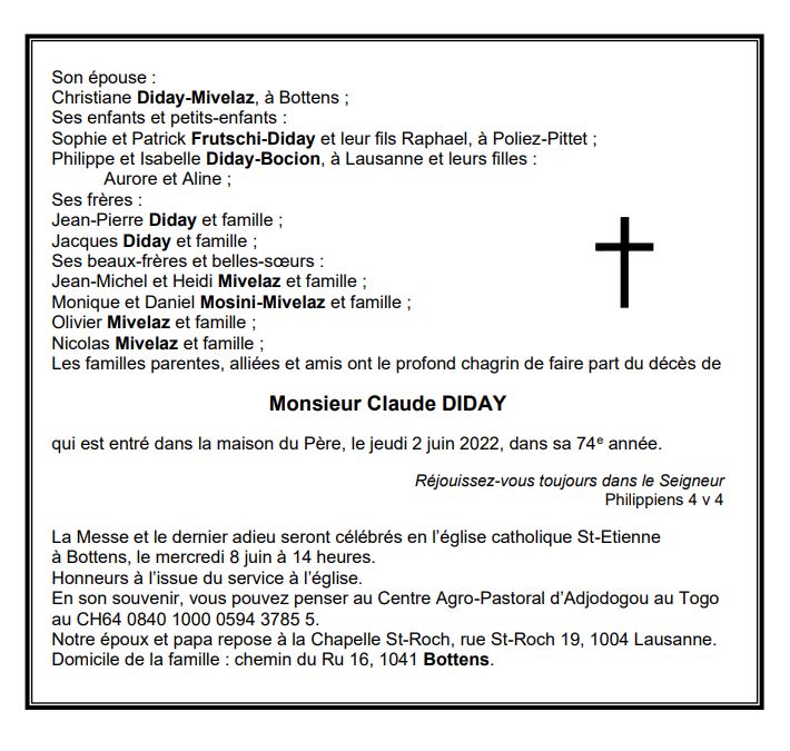 Monsieur Claude DIDAY 09 aoû. 1948 - 02 juin. 2022 Avis mortuaire PFG Télecharger PDF Partager sur: Galerie PreviousNext PreviousNext