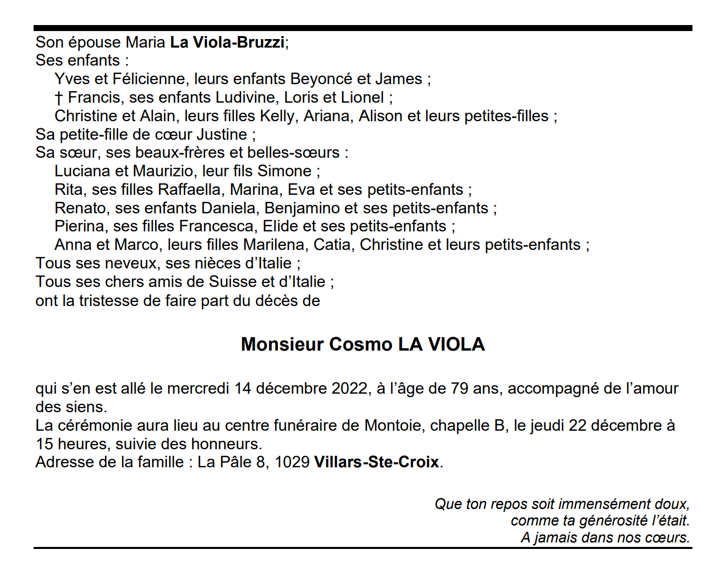 Monsieur Cosmo LA VIOLA 15 mai. 1943 - 14 déc. 2022 Avis mortuaire PFG Télecharger PDF Partager sur: Galerie PreviousNext PreviousNext
