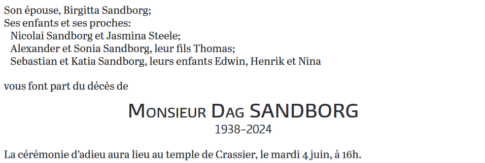 Monsieur Dag SANDBORG 23 sep. 1938 - 24 mai. 2024 Avis mortuaire PFG Télecharger PDF Partager sur: Galerie PreviousNext PreviousNext