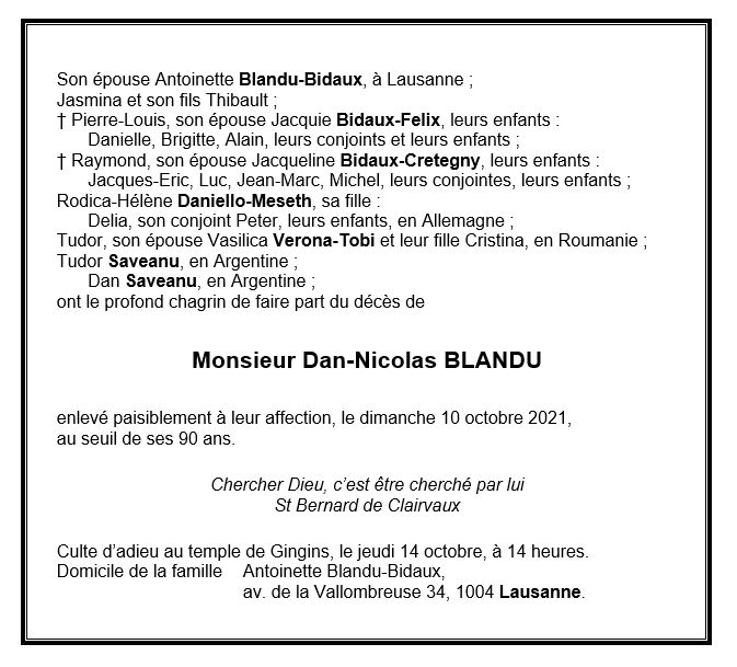 Monsieur Dan-Nicolas BLANDU 21 oct. 1931 - 10 oct. 2021 Avis mortuaire PFG Télecharger PDF Partager sur: Galerie PreviousNext PreviousNext
