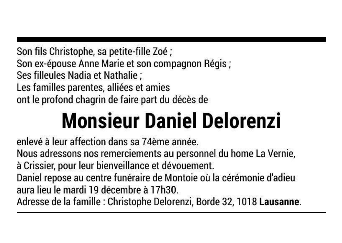 Monsieur Daniel Delorenzi 14 aoû. 1949 - 15 déc. 2023 Avis mortuaire PFG Télecharger PDF Partager sur: Galerie PreviousNext PreviousNext