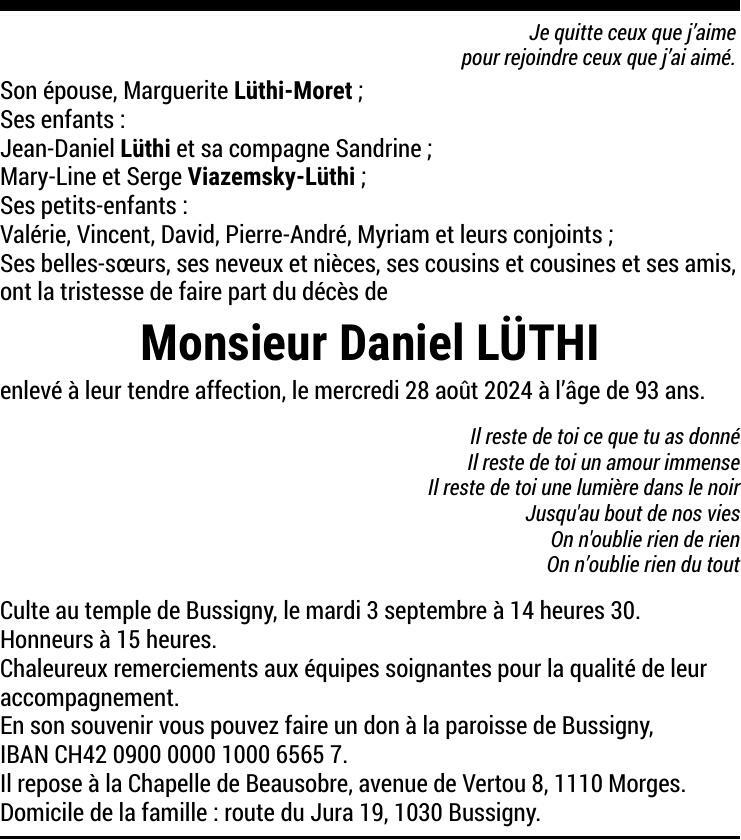 Monsieur Daniel LÜTHI 29 mai. 1931 - 28 aoû. 2024 Avis mortuaire PFG Partager sur: Galerie PreviousNext PreviousNext