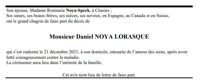 Monsieur Daniel NOYA LORASQUE 21 juil. 1948 - 21 déc. 2021 Avis mortuaire PFG Télecharger PDF Partager sur: Galerie PreviousNext PreviousNext