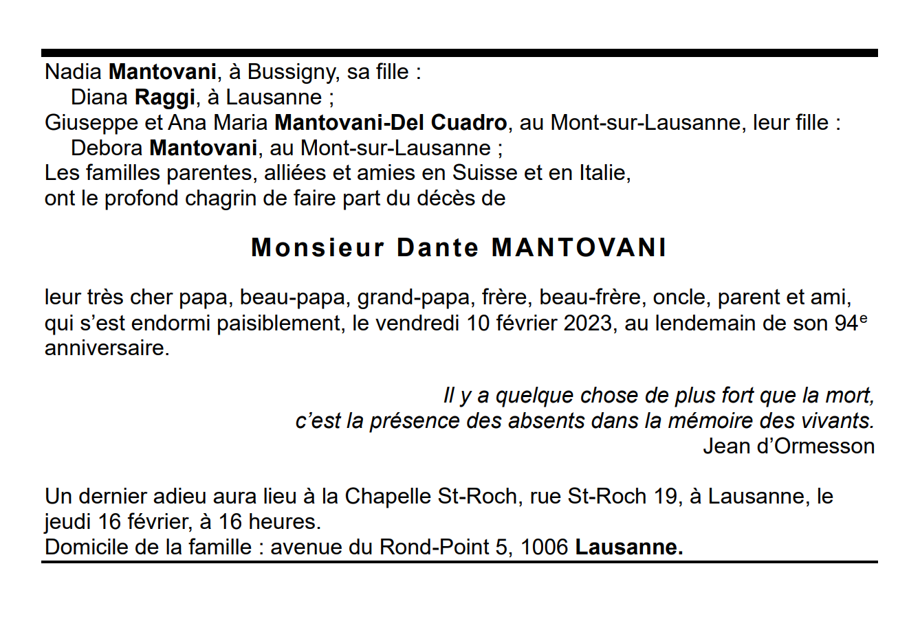 Monsieur Dante MANTOVANI 09 fév. 1929 - 10 fév. 2023 Avis mortuaire PFG Télecharger PDF Partager sur: Galerie PreviousNext PreviousNext