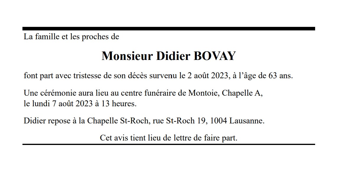Monsieur Didier BOVAY 20 fév. 1960 - 02 aoû. 2023 Avis mortuaire PFG Télecharger PDF Partager sur: Galerie PreviousNext PreviousNext