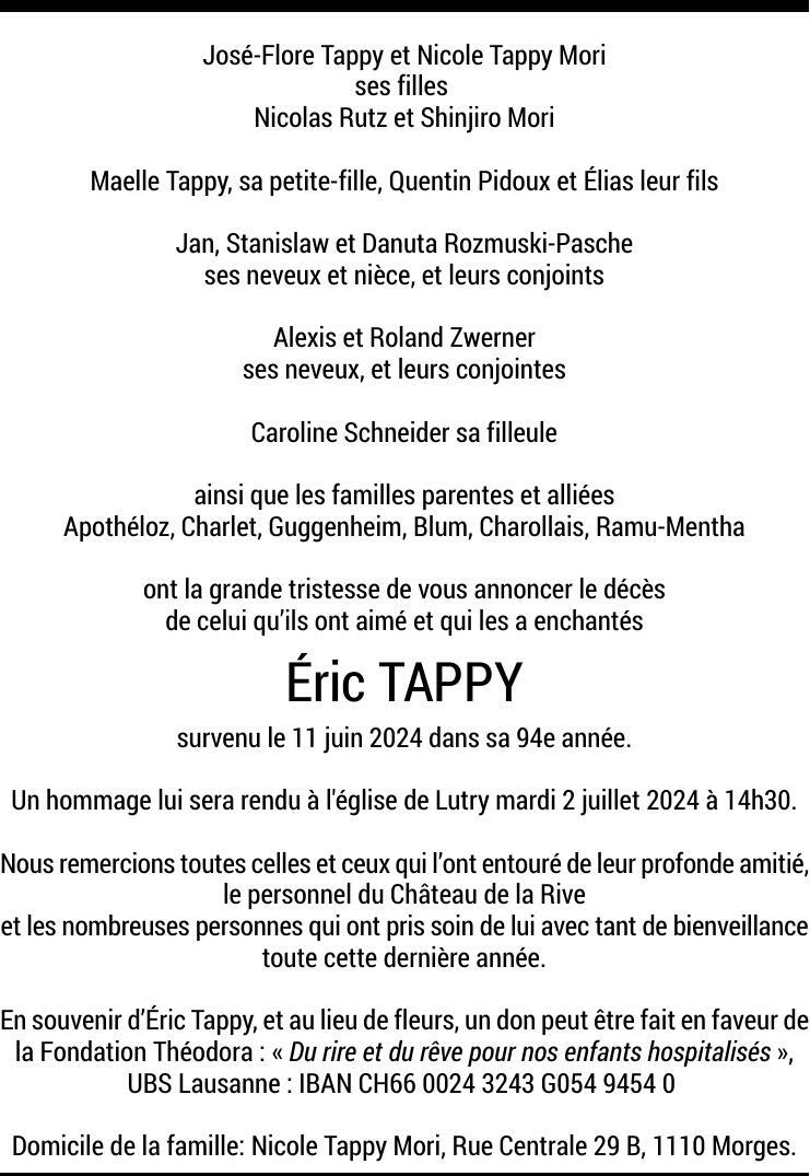 Monsieur Eric TAPPY 19 mai. 1931 - 11 juin. 2024 Avis mortuaire PFG Partager sur: Galerie PreviousNext PreviousNext
