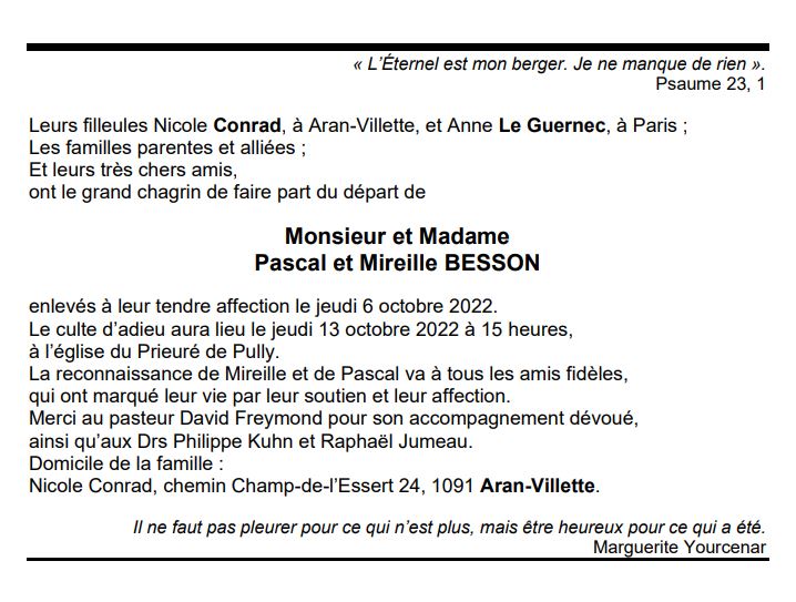 Monsieur et Madame Pascal et Mireille BESSON 24 mar. 1931 - 06 oct. 2022 Avis mortuaire PFG Télecharger PDF Partager sur: Galerie PreviousNext PreviousNext