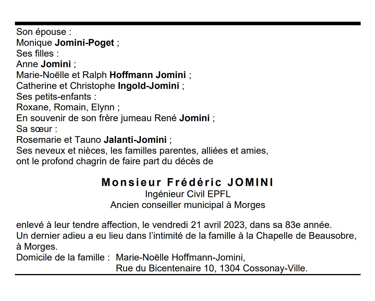 Monsieur Frédéric JOMINI 03 juin. 1940 - 21 avr. 2023 Avis mortuaire PFG Télecharger PDF Partager sur: Galerie PreviousNext PreviousNext