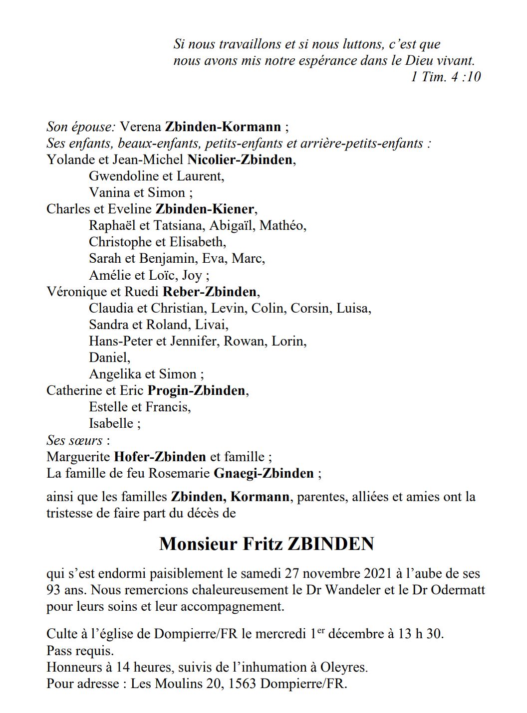 Monsieur Fritz ZBINDEN 04 déc. 1928 - 27 nov. 2021 Avis mortuaire PFG Télecharger PDF Partager sur: Galerie PreviousNext PreviousNext