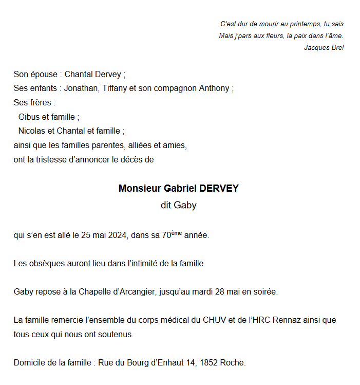 Monsieur Gabriel DERVEY 10 juin. 1954 - 25 mai. 2024 Avis mortuaire PFG Télecharger PDF Partager sur: Galerie PreviousNext PreviousNext