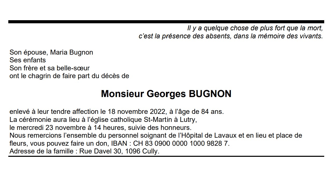 Monsieur Georges BUGNON 20 avr. 1938 - 18 nov. 2022 Avis mortuaire PFG Télecharger PDF Partager sur: Galerie