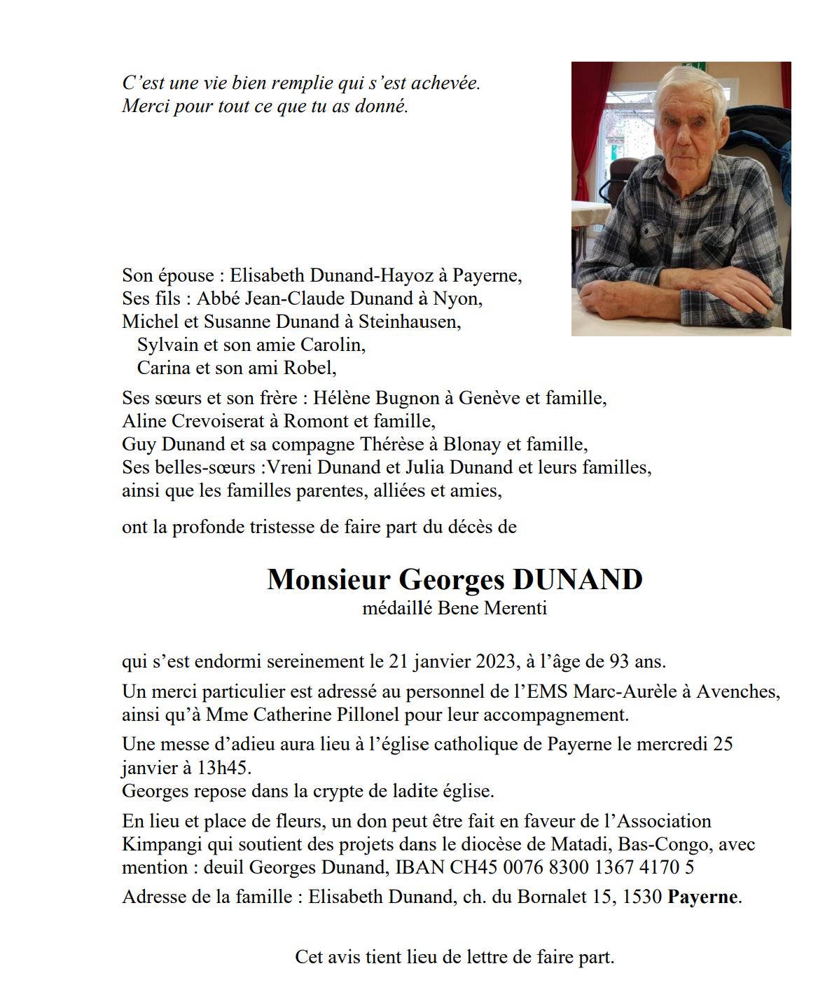 Monsieur Georges DUNAND 11 aoû. 1929 - 21 jan. 2023 Avis mortuaire PFG Télecharger PDF Partager sur: Galerie PreviousNext PreviousNext