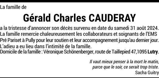 Monsieur Gérald Charles CAUDERAY 17 sep. 1930 - 31 aoû. 2024 Avis mortuaire PFG Partager sur: Galerie